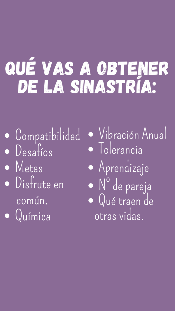 La Sinastría de Pareja es un informe que combina los números más importantes de ambos, para hacer consciente qué vinieron a trabajar juntos, qué aprenden uno del otro. Los desafíos a atravesar, compatibilidades. Qué vibración anual están transitando para saber qué decisiones les conviene tomar según las energías del año en curso. Qué los acerca, qué los aleja?